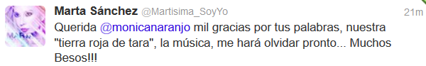 Hace unos minutos los artistas Mónica Naranjo y David Bisbal han mostrado su apoyo a Marta por medio de su Twitter.